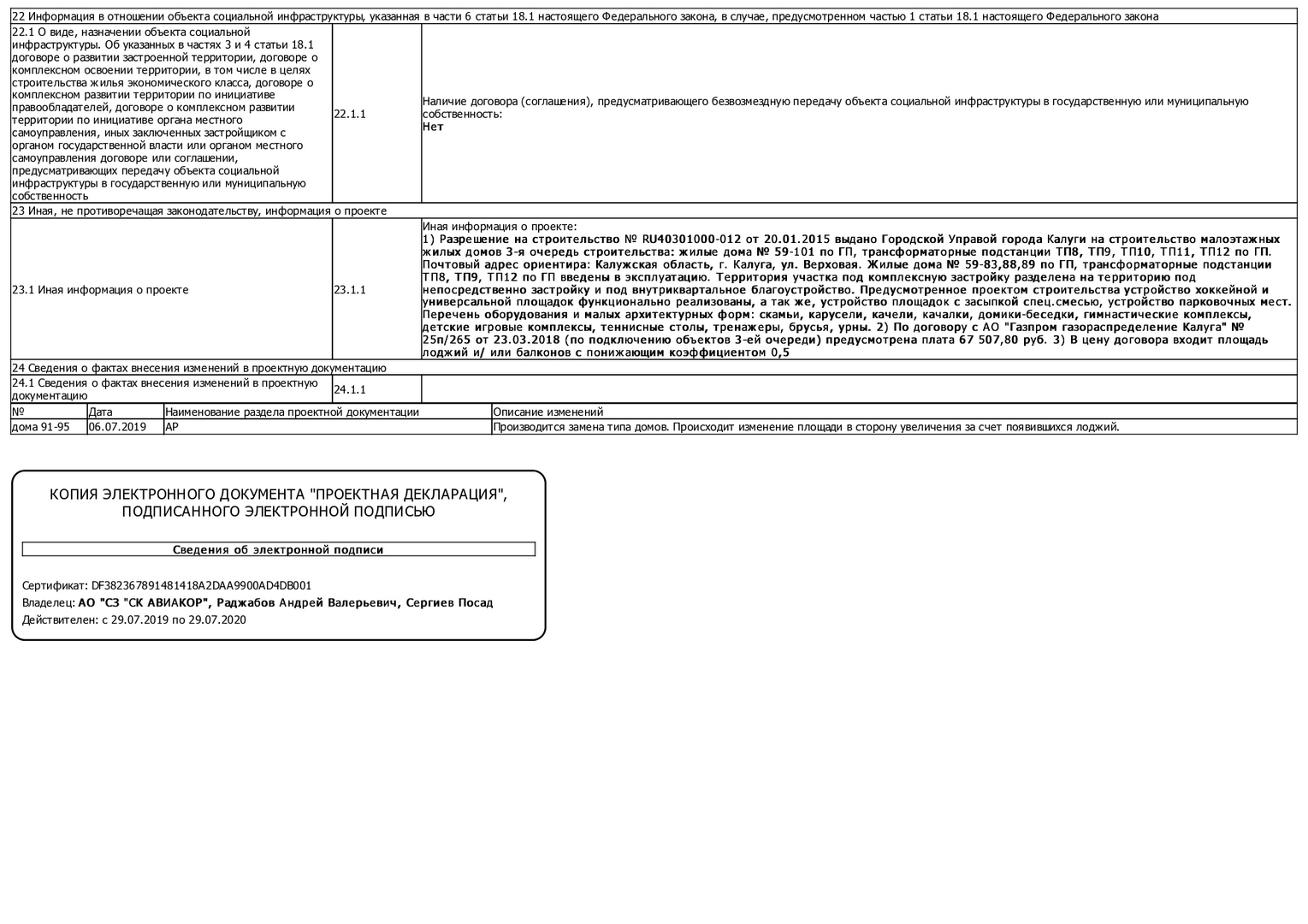 Изменения от 06.11.2019 к проектной декларации "Малоэтажный жилой дом № 92 по ГП"