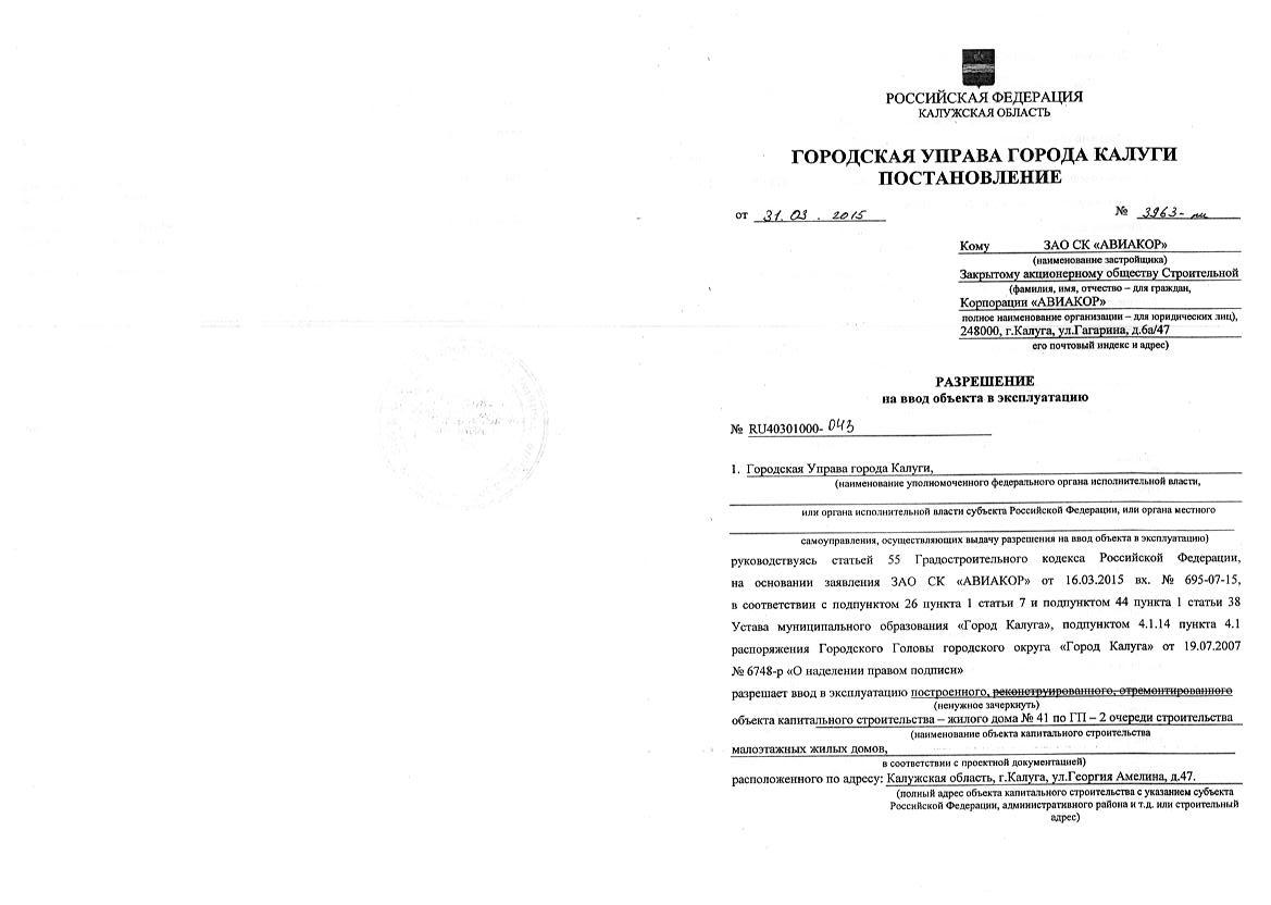 Разрешение на ввод объекта в эксплуатацию "Малоэтажные жилые дома 2-очередь строительства – жилой дом №41 по ГП" от 31.03.2015 г.