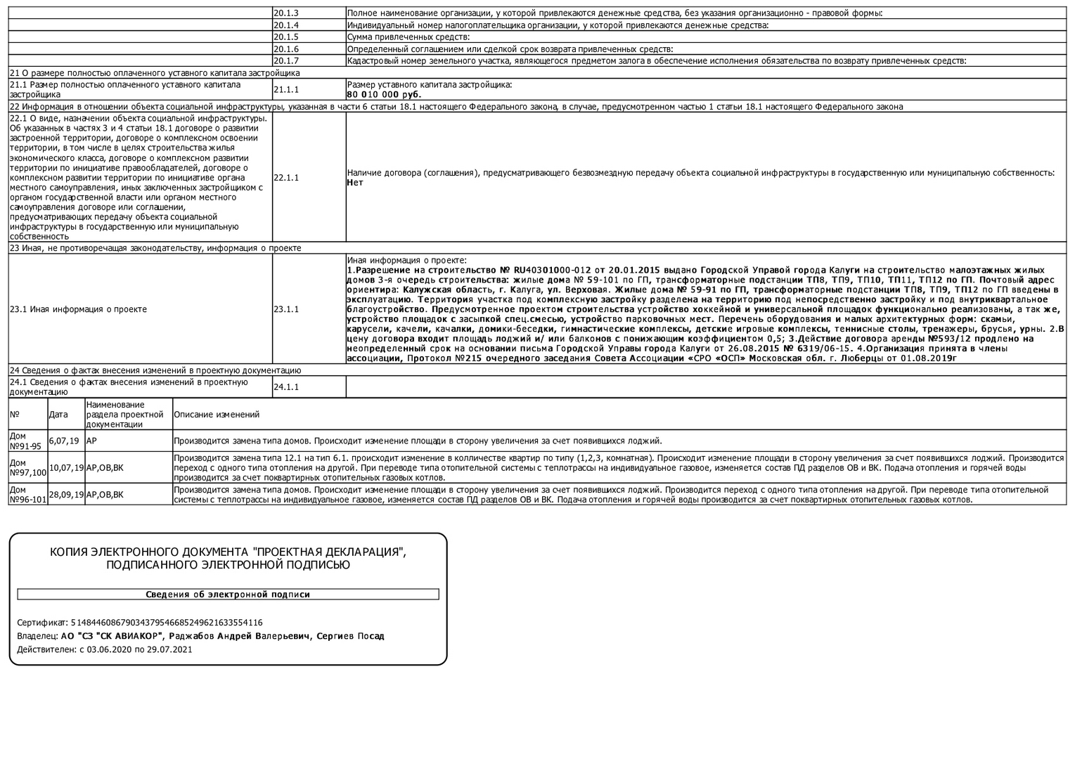 Изменения от 10.08.2020 к проектной декларации "Малоэтажный жилой дом № 101 по ГП"