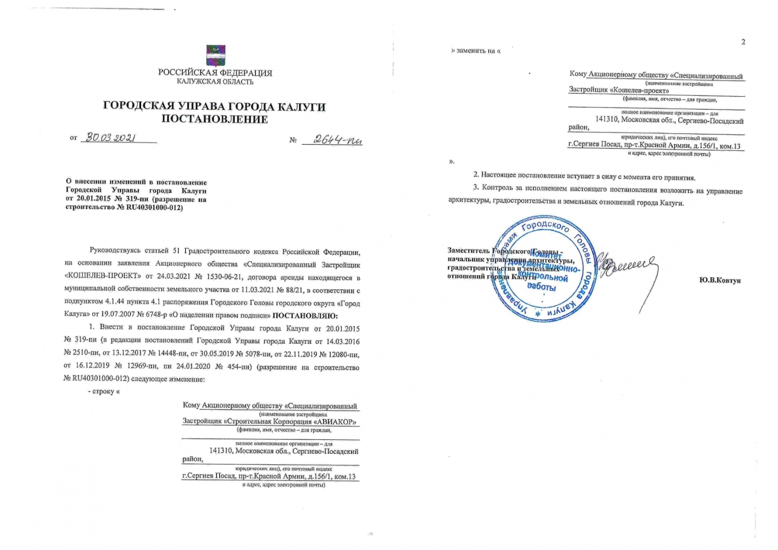 Постановление о внесении изменений в постановление Городской Управы города Калуги от 20.01.2015 № 319-пи (разрешение на строительство № RU40301000-012)