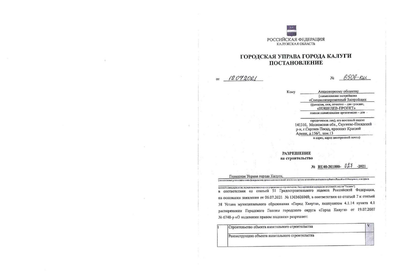 Разрешение на строительство (постановление Городской Управы города Калуги от 12.07.2021 № 6506-пи)