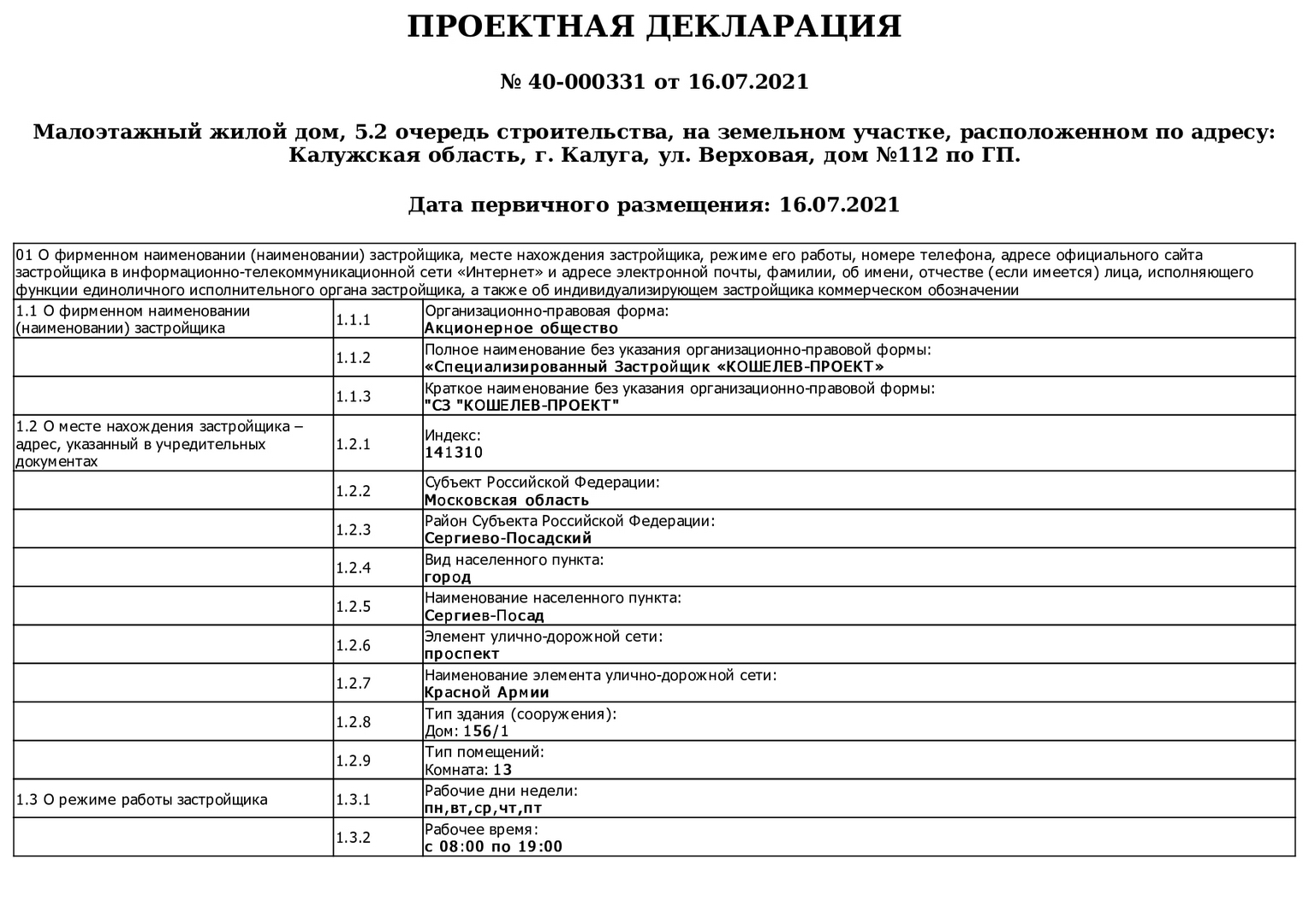 Проектная декларация "Малоэтажный жилой дом №112 по ГП" от 16.07.2021г.
