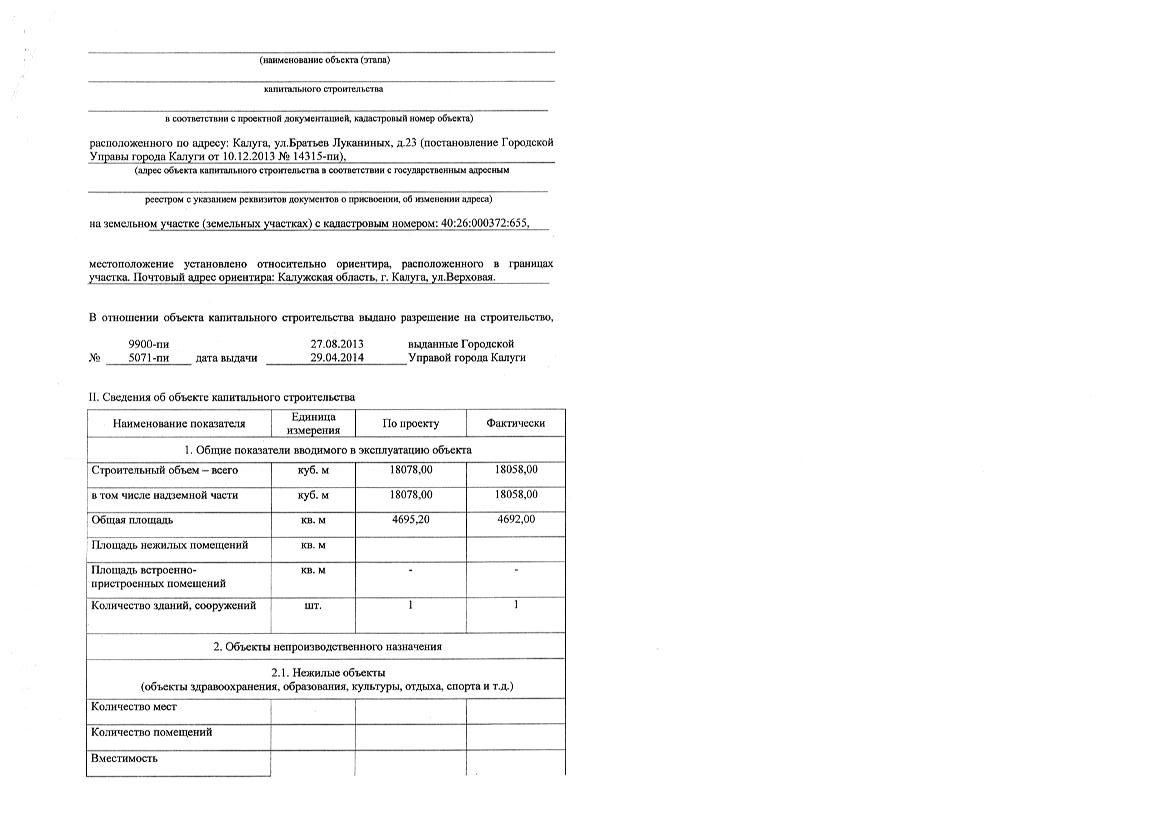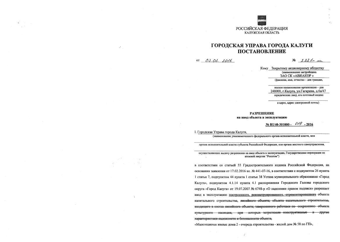 Разрешение на ввод объекта в эксплуатацию "Малоэтажные жилые дома 2-очередь строительства – жилой дом № 58 по ГП" от 03.03.2016 г.