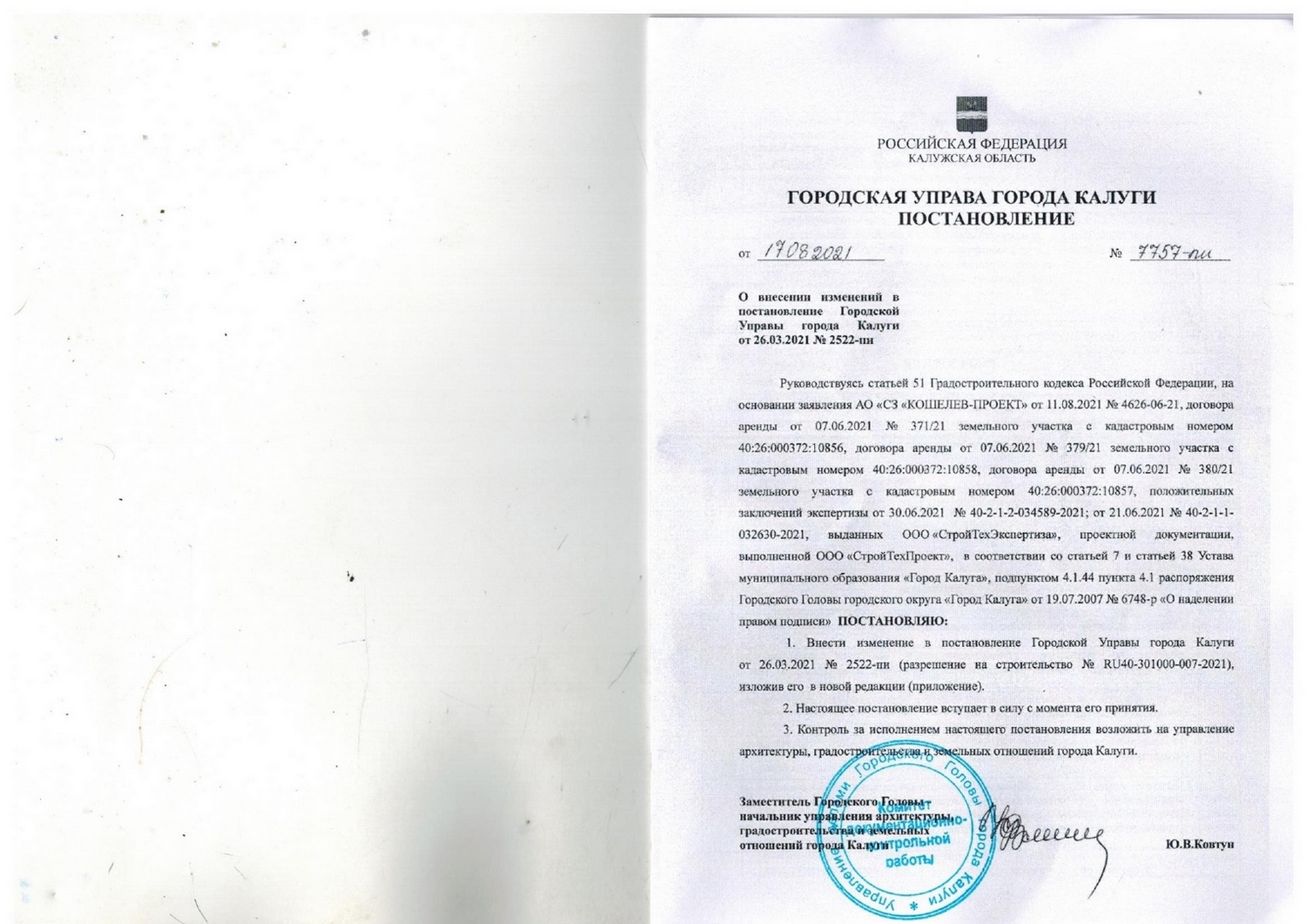 Постановление Городской Управы города Калуги от 17.08.2021г. № 7757-пи "О внесении изменений в постановление от 26.03.2021г. №2522-пи"