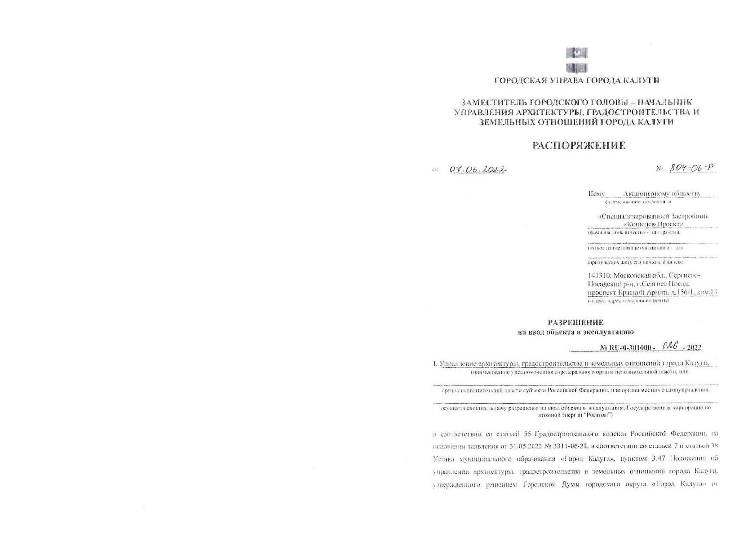 Разрешение на ввод объектов в эксплуатацию