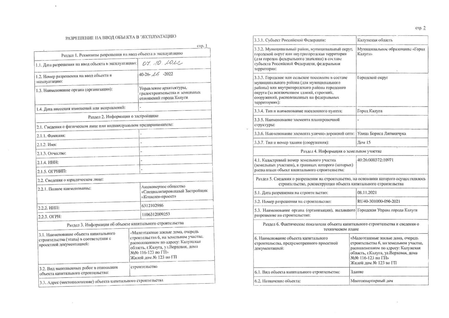 Разрешение на ввод объекта в эксплуатацию 123 дом по ГП