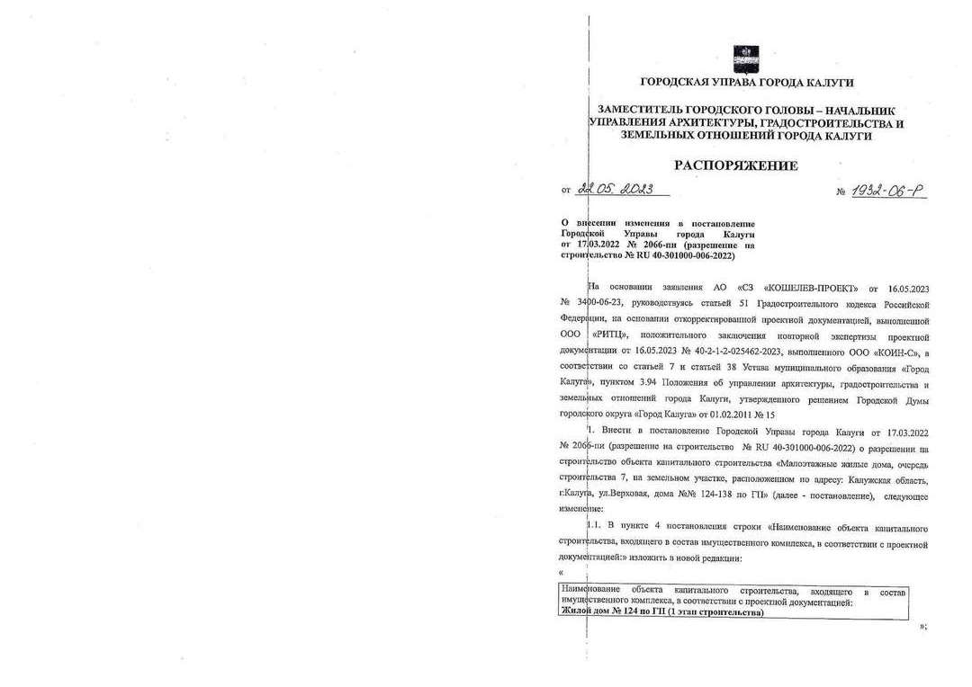Внесение изменения в разрешение на строительство (распоряжение Городской Управы города Калуги от 22.05.2023г. №1932-06-Р)