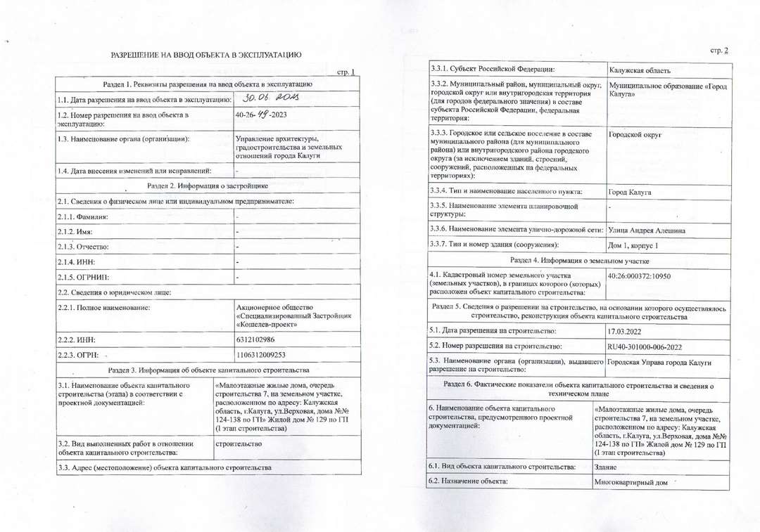 Разрешение на ввод объекта в эксплуатацию 129 по ГП