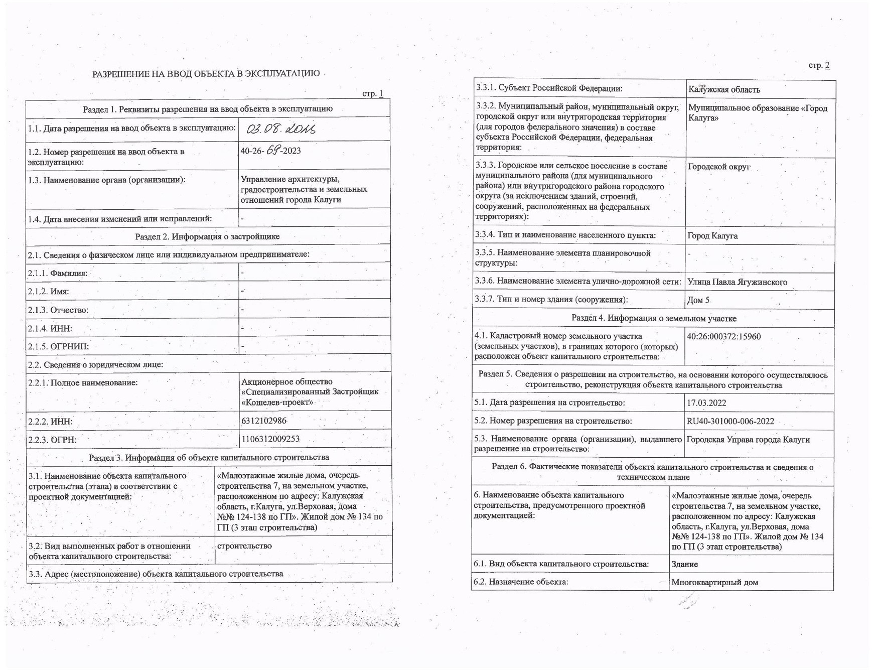Разрешение на ввод объекта в эксплуатацию 134 по ГП.
