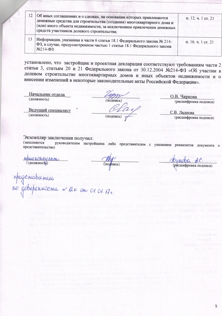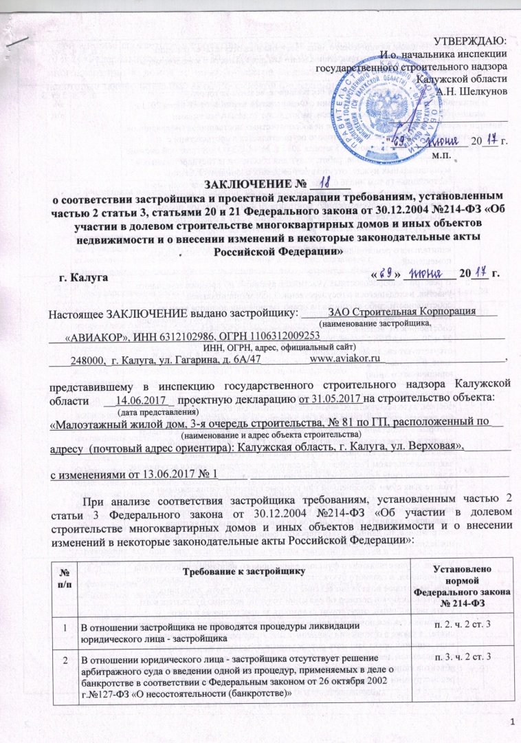 Заключение о соответствии застройщика и проектной декларации требованиям ФЗ от 30.12.2004 № 214-ФЗ, 81 дом по ГП