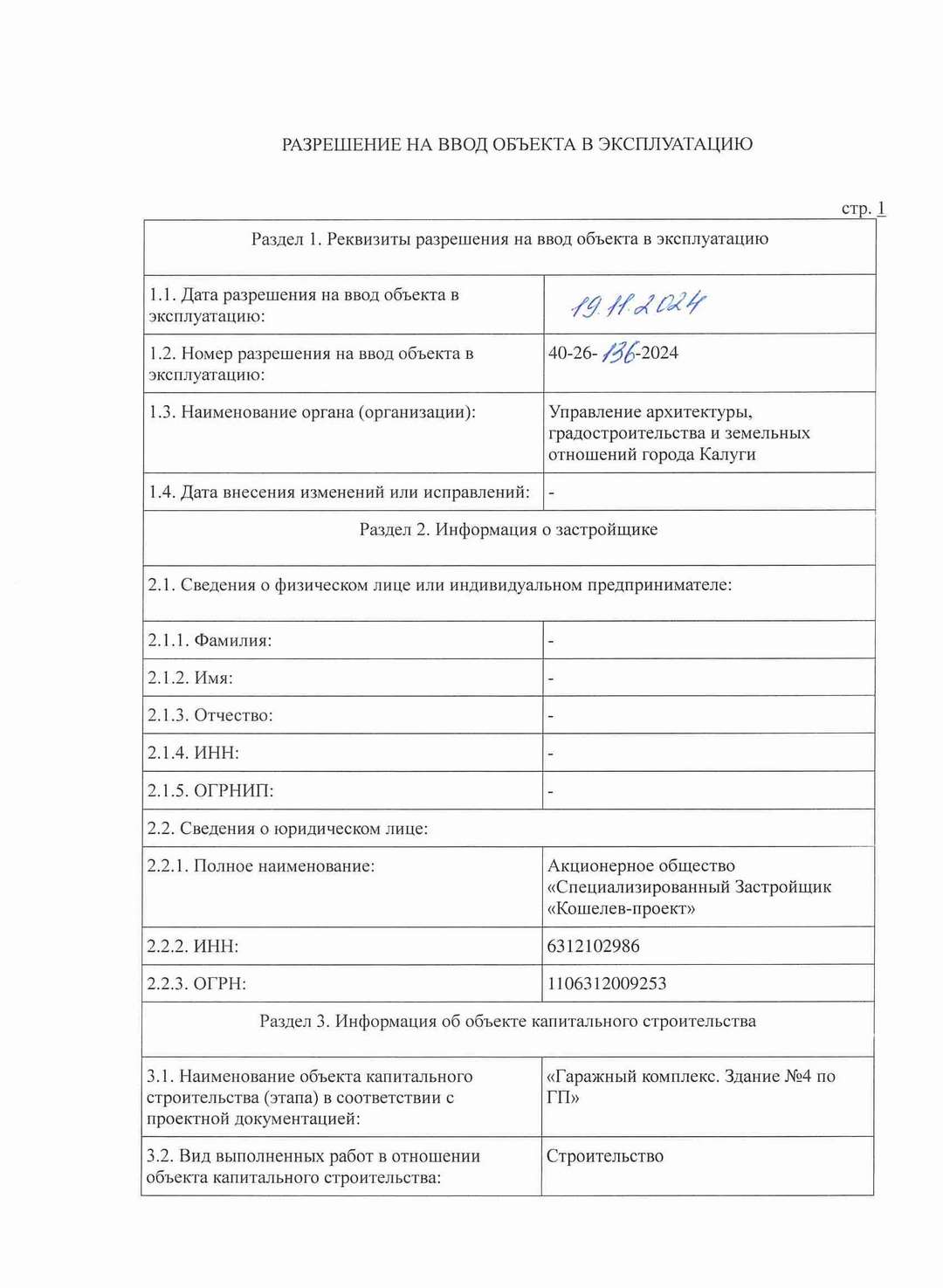 Разрешение на ввод объекта в эксплуатацию здание №4 по ГП