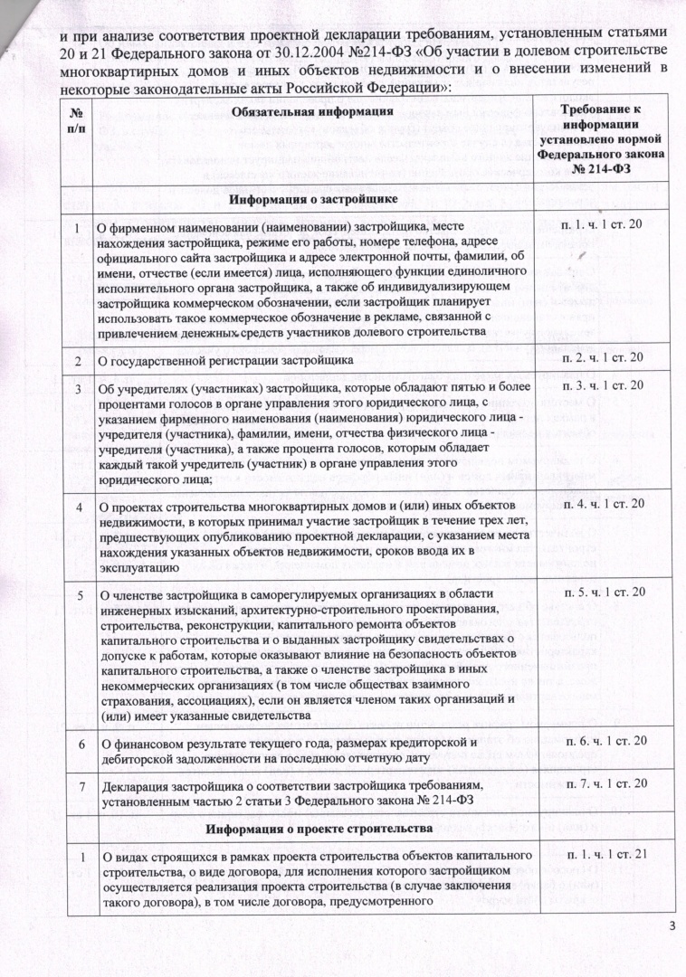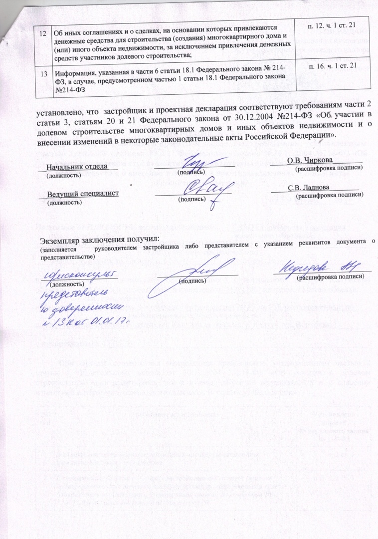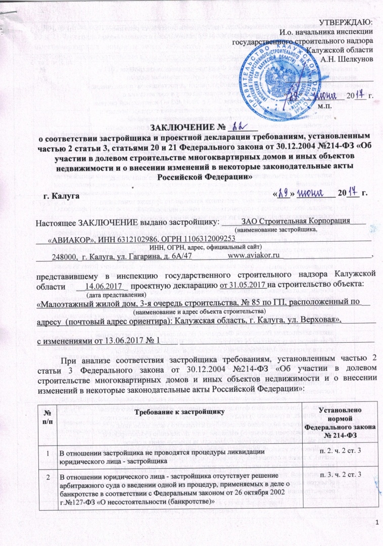 Заключение о соответствии застройщика и проектной декларации требованиям ФЗ от 30.12.2004 № 214-ФЗ, 85 дом по ГП