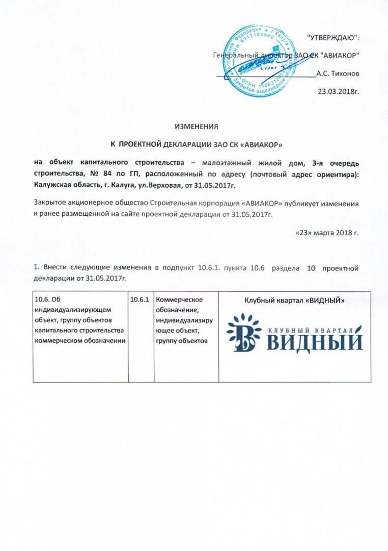 Изменения от 23.03.2018г. к проектной декларации Малоэтажный жилой дом №84 по ГП от 31.05.2017г.