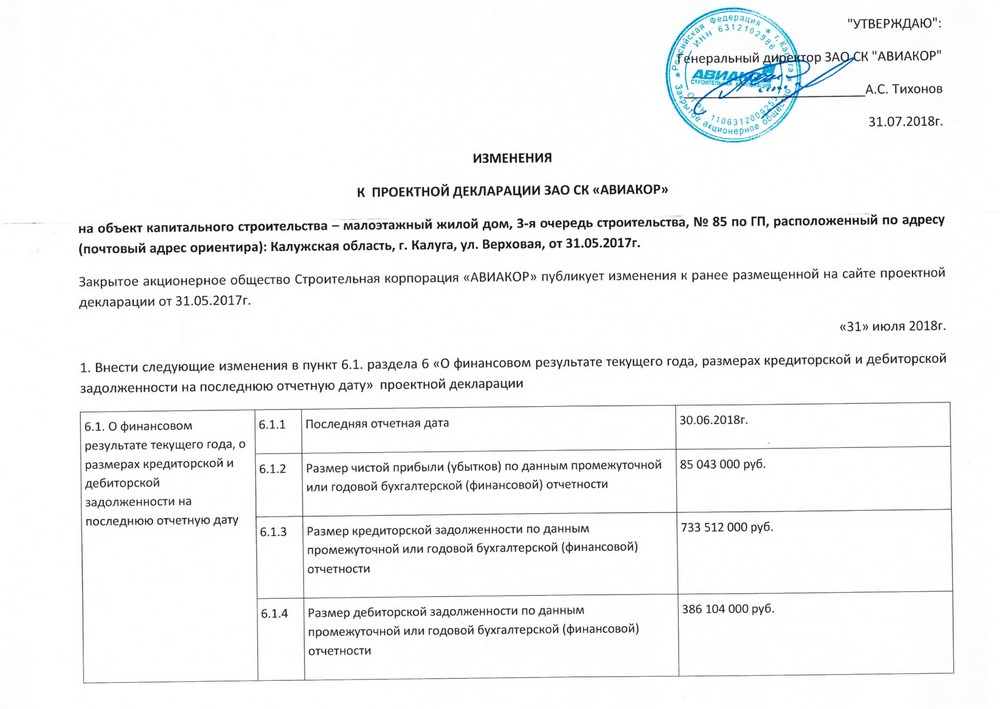 Изменения от 31.07.2018г. к проектной декларации "Малоэтажный жилой дом № 85 по ГП" от 31.05.2017г.