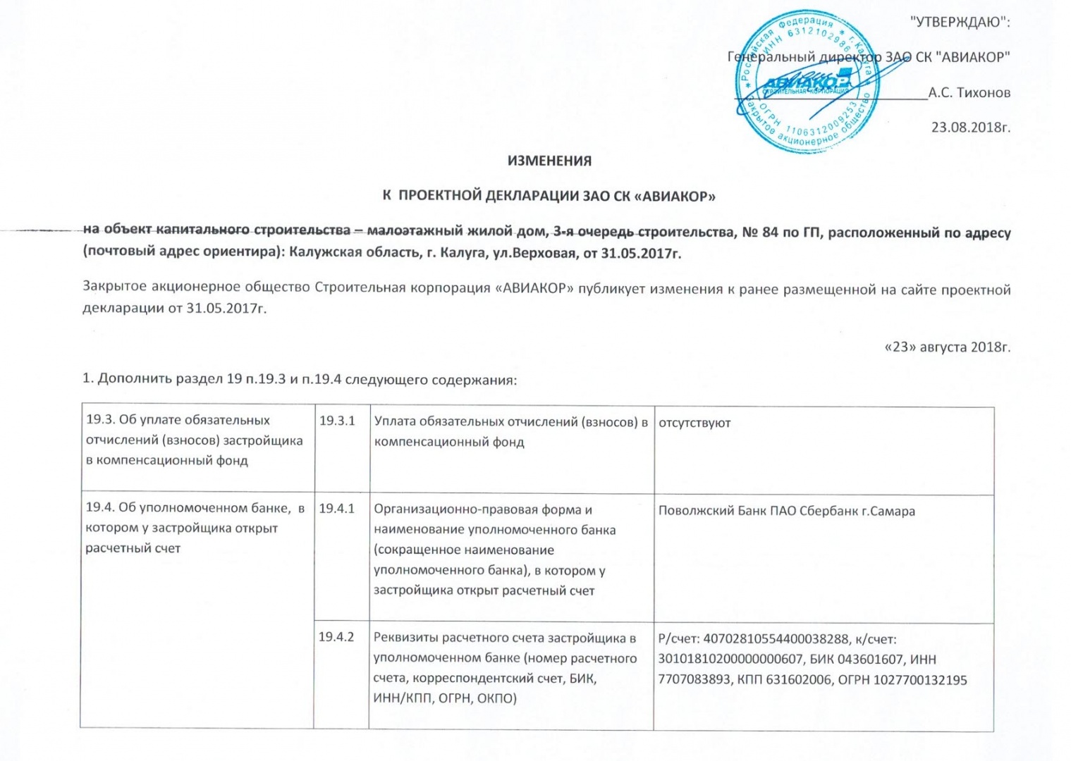 Изменения от 23.08.2018г. к проектной декларации "Малоэтажный жилой дом №84 по ГП" от 31.05.2017г.