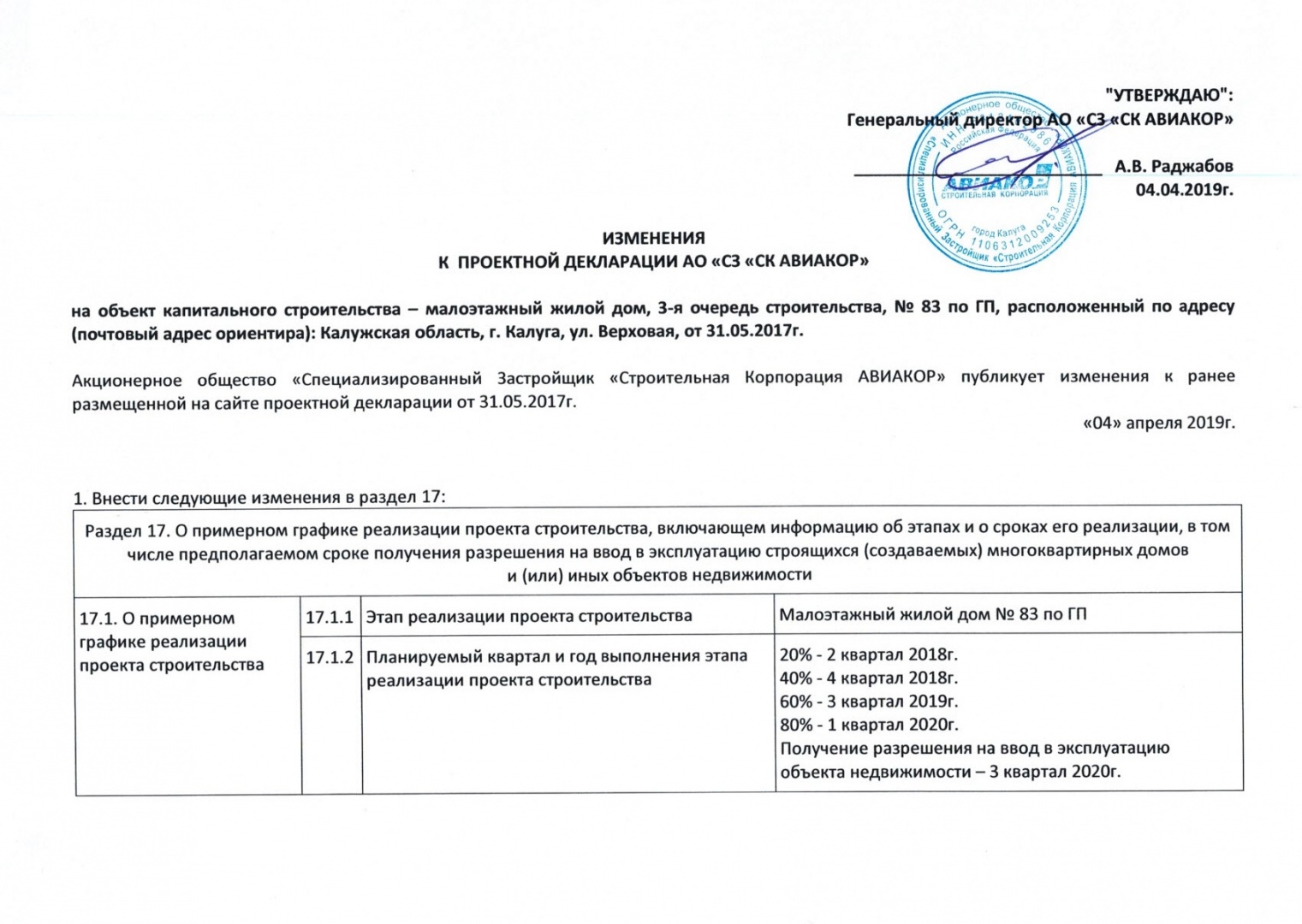 Изменения от 04.04.2019г. к проектной декларации "Малоэтажный жилой дом № 83 по ГП" от 31.05.2017г.