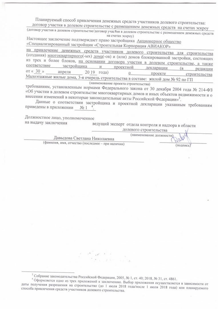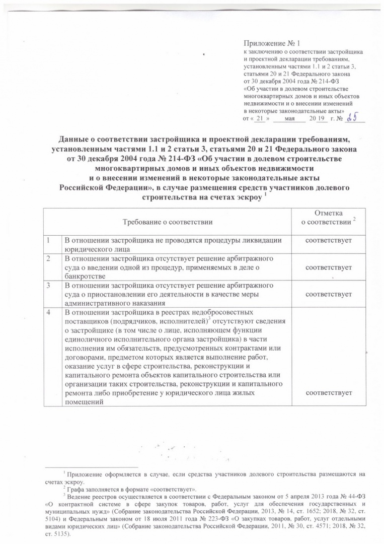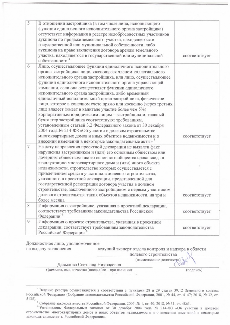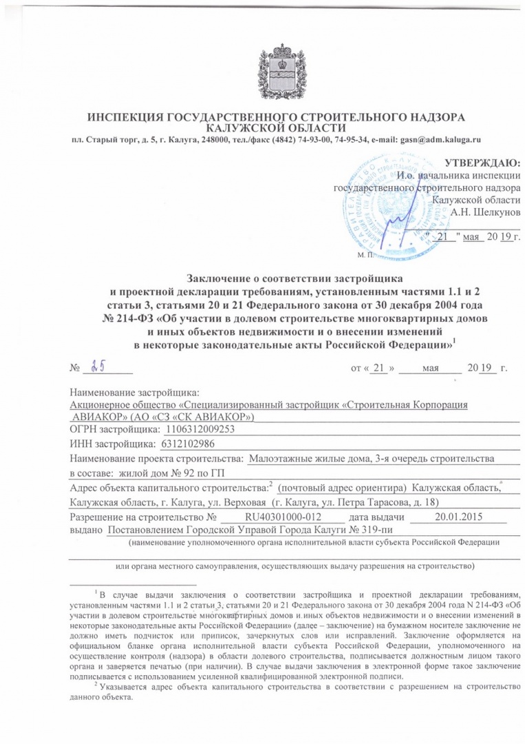 Заключение о соответствии застройщика и проектной декларации требованиям ФЗ от 30.12.2004 № 214-ФЗ, 92 дом по ГП