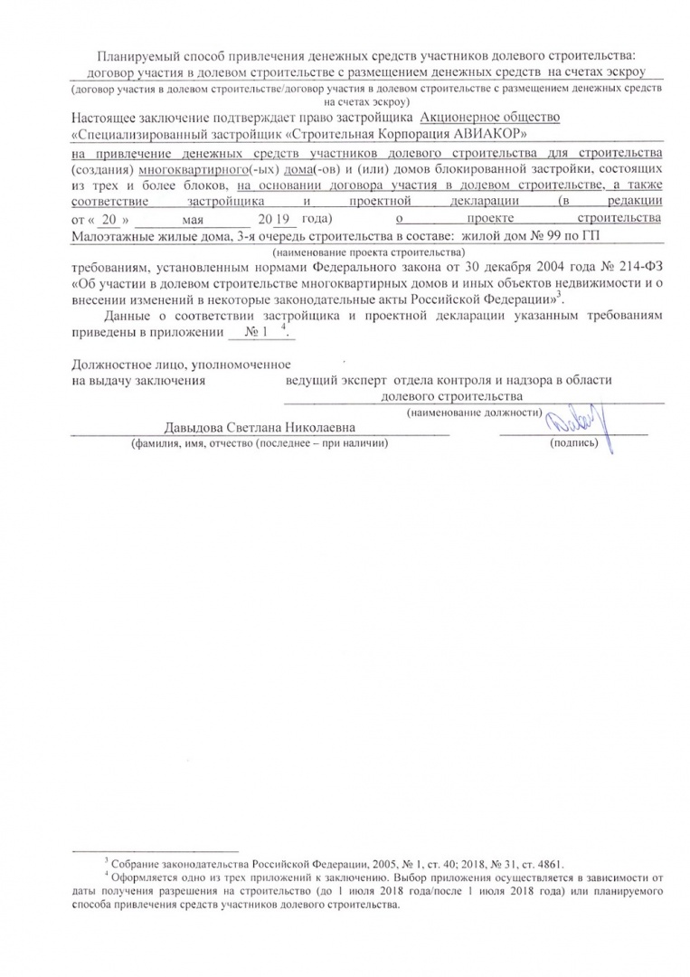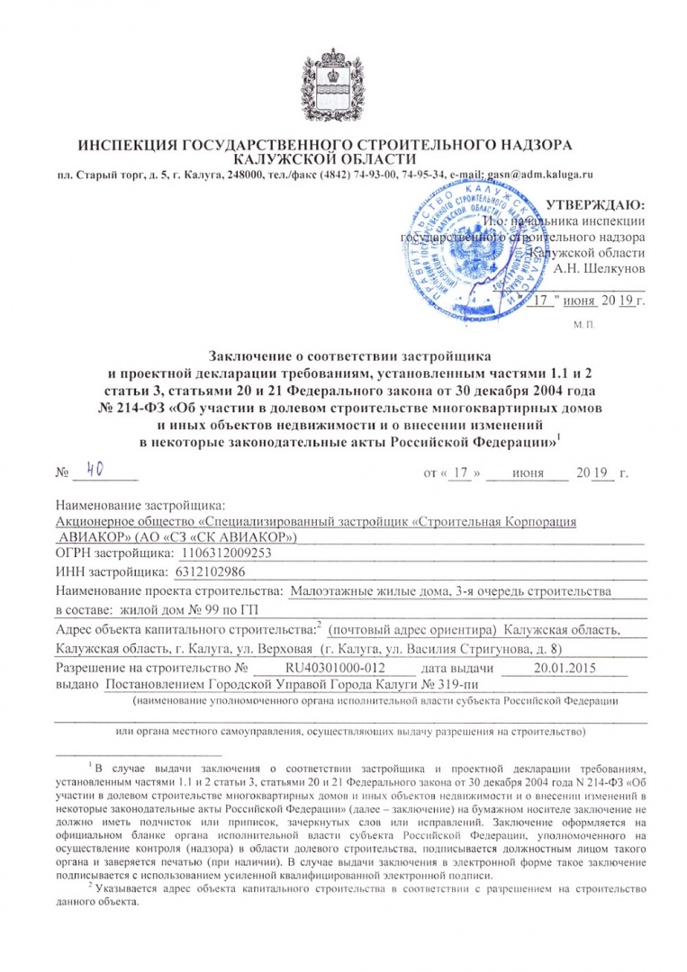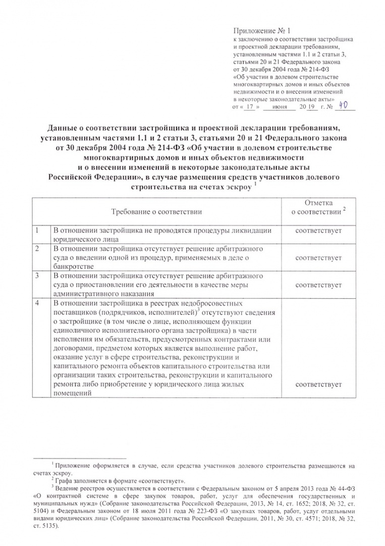 Заключение о соответствии застройщика и проектной декларации требованиям ФЗ от 30.12.2004 № 214-ФЗ, 99 дом по ГП